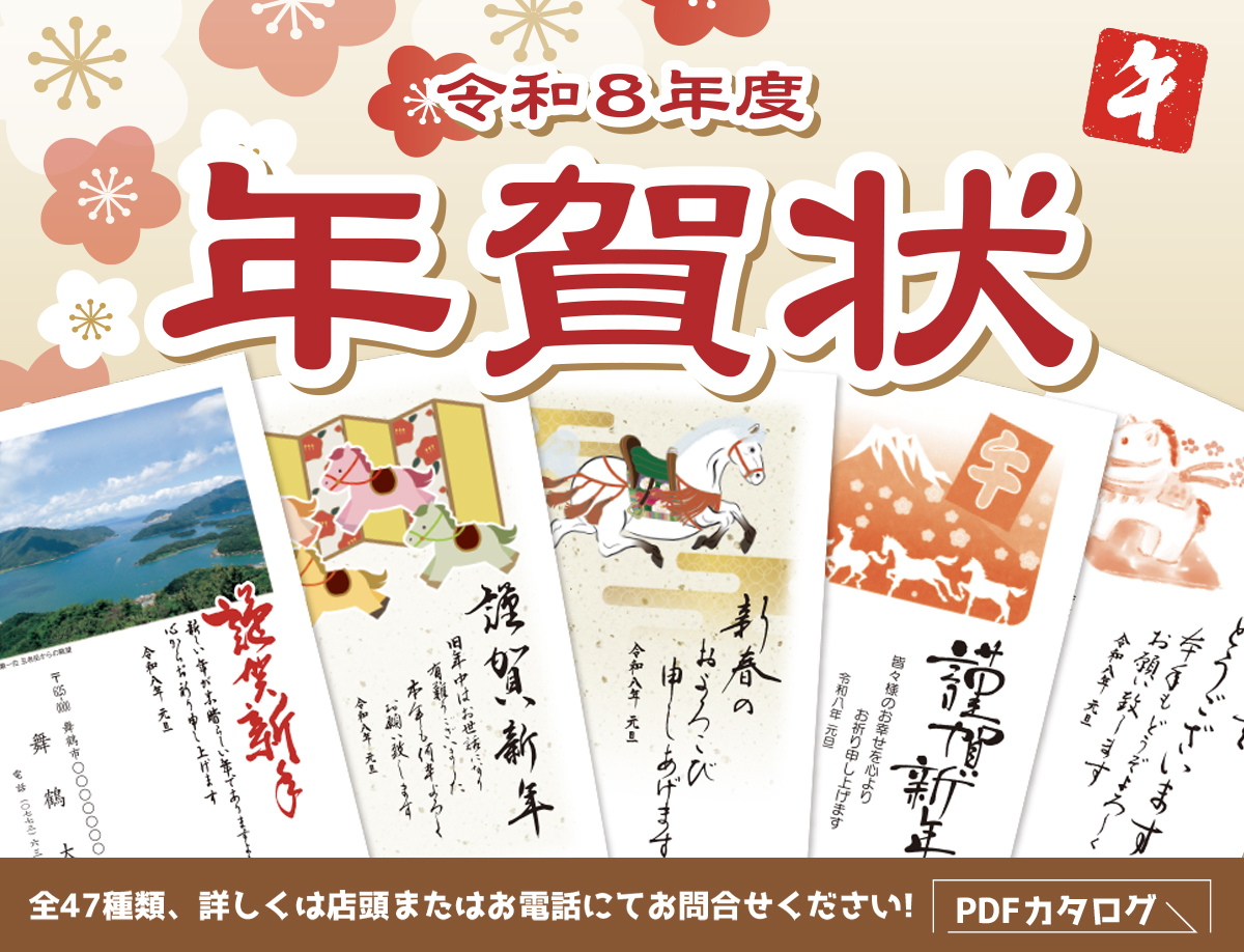 11/1より2026(令和8)年度の年賀状受付を開始。定番の干支・馬はもちろん、当社オリジナル年賀状〝舞鶴郷土シリーズ〟として地元舞鶴の風景を使用した年賀状もご用意しております。市外・県外の方に舞鶴市の風景と共に新年のご挨拶をお送りしませんか?
